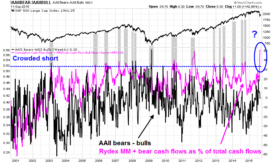 My own analysis, based on a combination of AAII sentiment surveys and Rydex data also tells the same story. The chart below shows the evolution of AAII sentiment (black line) and Rydex funds flows (pink lines) over the last 15 years. Whenever either of these metrics get into a crowded short reading (shaded areas), the stock market has historically bottomed in the past. (As an aside, it is interesting that these indicators appear to be better with its buy signals than sell signals).
