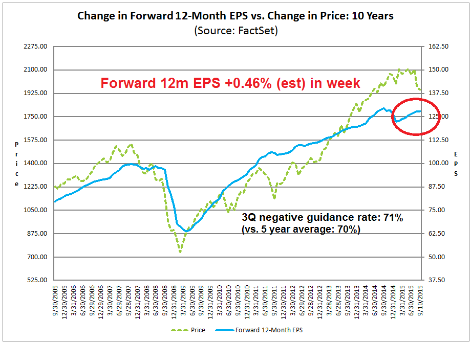 Data from John Butters of FactSet shows that forward EPS estimates continue to rise, which is bullish for equities (annotations are mine):