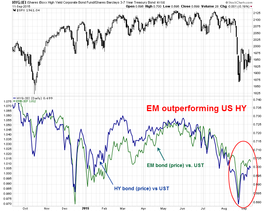 What about the side-effects of a China slowdown on the emerging market economies? Isn't the combination of slowing Chinese growth and Fed tightening supposed to be a lethal combination? There seems to be some good news on that front as well. The chart below shows the relative performance of US HY bond prices (bottom panel, black line) and EM USD bond prices (bottom panel, green line) relative to their duration-equivalent US Treasury proxies. The last couple of weeks has seen EM bonds outperform US HY, which is a definite vote of confidence by the credit markets in the EM outlook.