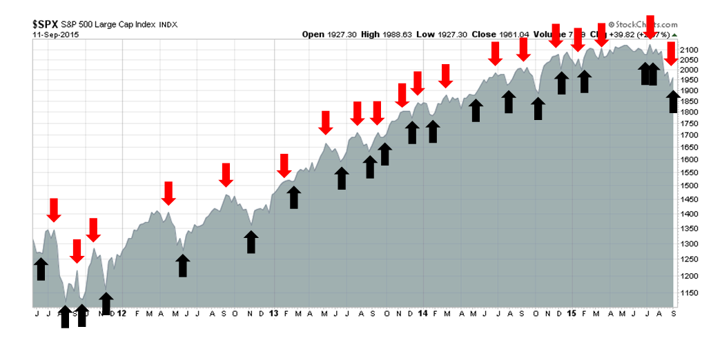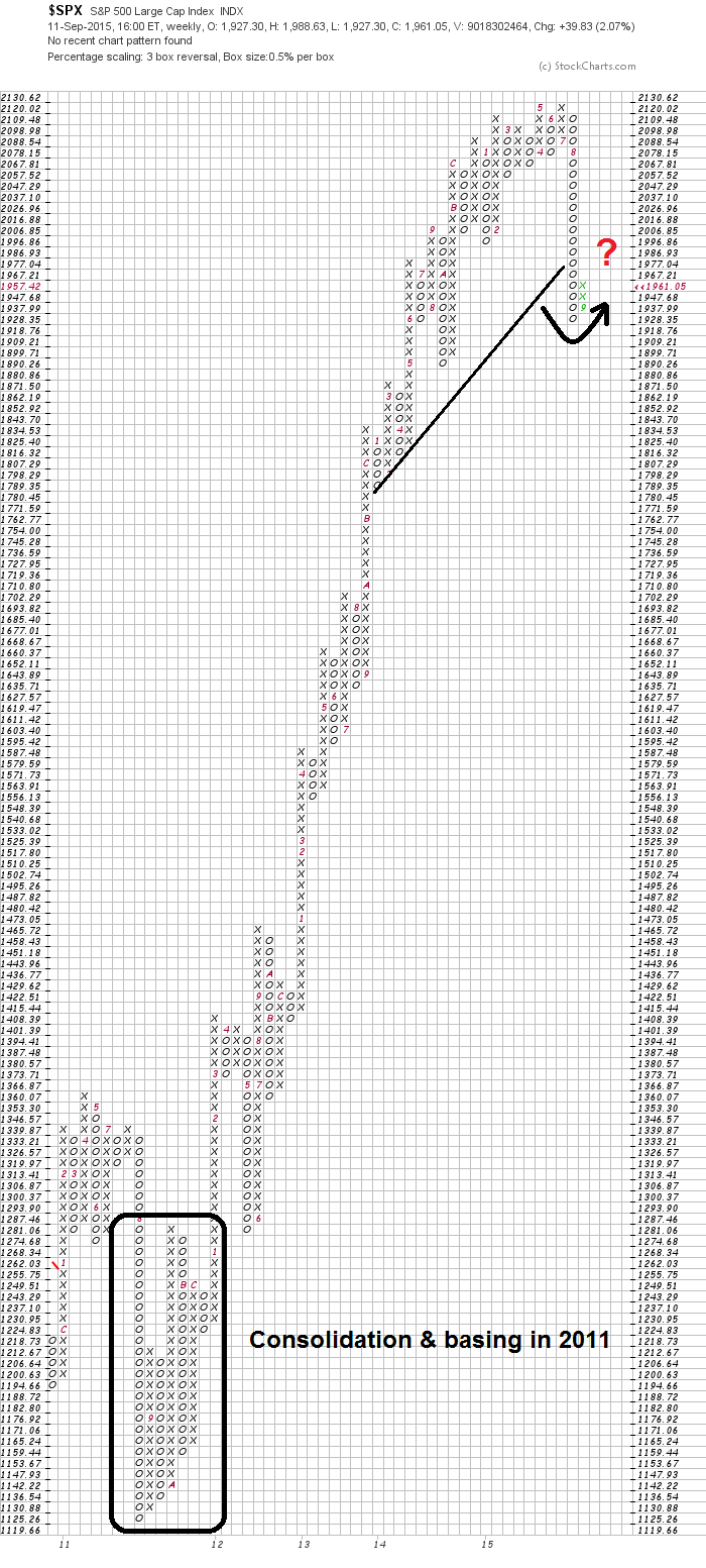 The point and figure chart of the SPX tells the story. Take 2011 as an example, the market went through a choppy sideways period before rallying to new highs. A V-shaped bottom in 2015 therefore looks highly unlikely.