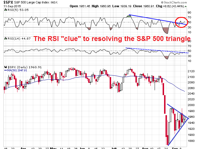 Looking to the week ahead, my inner trader flipped from bearish to bullish at the market close on Friday . The bearish call did not work as negative price momentum ebbed and the SPX neared the apex of a triangle wedge formation. However, there was a key "clue" as the downtrend in RSI(5) was broken, though the longer dated RSI(14) downtrend remained intact.