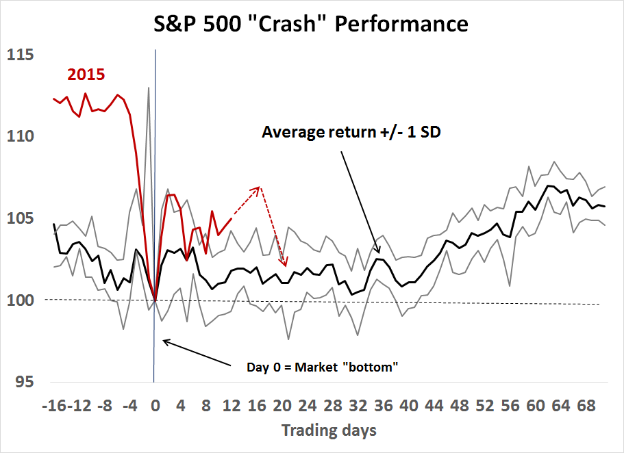 Putting it all together, I updated the chart of the price pattern past market "crashes" I showed last week. My best wild-eyed guess calls for a rally next week, to be followed by a decline the following week, possibly to test either the August 2015 or October 2014 lows.