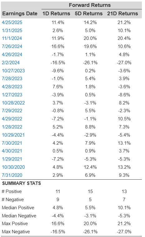 - There are 20 earnings data points recorded over the last five years, with 11 positive and 9 negative one-day (1D) returns observed. In summary, positive 1D returns were seen about 55% of the time.