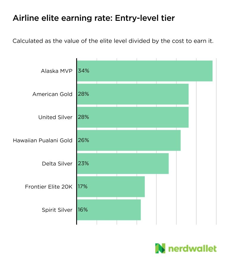 NerdWallet compared these two variables across entry-level elite status for all the major airlines and found that Alaska Airlines’ MVP status offered the best bang for the buck, followed by AAdvantage Gold on American Airlines and United Silver status.