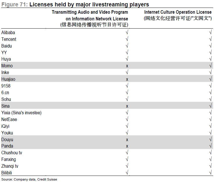 Similarly, being a big established player, YY will win over smaller competitors from a regulation perspective. The government has tightened regulation on live broadcast in September, making new entrants more difficult. New regulations require (1) platforms to have RMB10mn of minimum registered capital and (2) platforms without a license to be either state-owned or state-controlled. Multiple operating licenses are also needed.