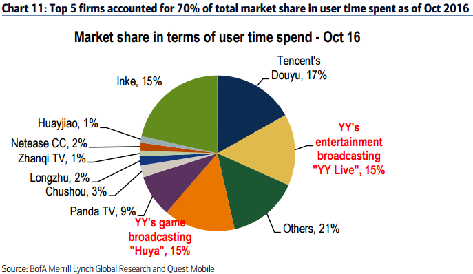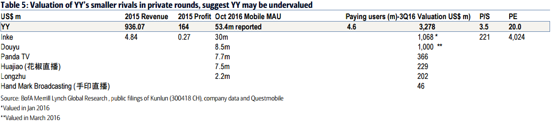 Inke is still in the early stage of monetization but it is already valued close to one-third of YY's market cap. Douyu has fewer than 20% of YY's users but it's valued at about 50% of YY.