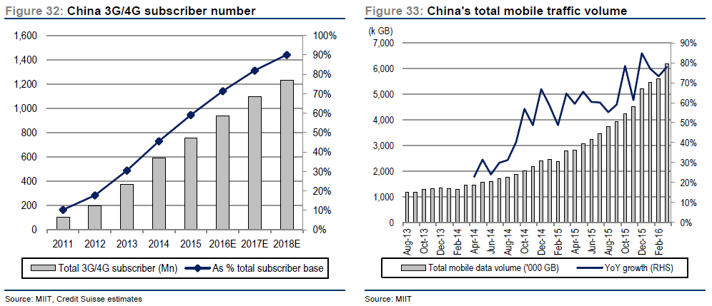 ChineseInternetcompanies [e.g. Alibaba ( BABA ), Tencent ( TCEHY ) (TCTZD), Sina ( SINA )] saw tremendous growth in recent years thanks to the growing penetration ofInternet and the high population concentration in the country. The new wave of growth for these companies lies in the 3G/4G coverage improvement, resulting in renewed growth in the Chinese technology sector. Live broadcasting is no exception. Per MIIT and Credit Suisse estimates, total 3G/4G subscriber grew at 64% CAGR between 2011 and 2016 and it is expected to reach 1.2 bn in 2018 with a 90% penetration rate.