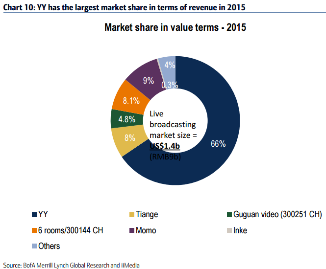YY Inc. ( YY ) is a social platform in China that features live broadcasting. The overall company can be broken into the following sub-businesses: YY Live (56%), Online Dating (14%), Game Broadcasting (9%), Online Games (8%), Online Education (2%) and Others (11%). Having the most market share and the most comprehensive products on a single platform amongst players in the Chinese live broadcast sector, YY is a good play on the increasingly popular live broadcast. We recommend long YY at $38.09 (1/4/17 closing).