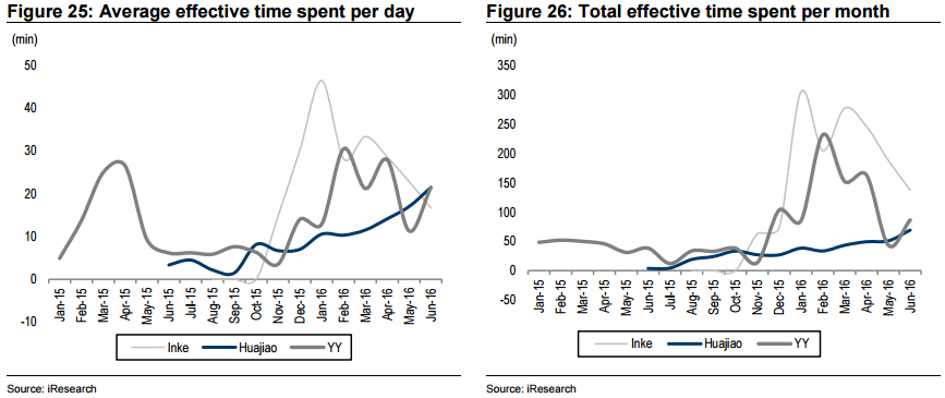 Despite not investing as heavily in marketing as its competitors, YY stays consistently ahead in terms of traffic and user engagement. Its gap to Inke is also narrowing.