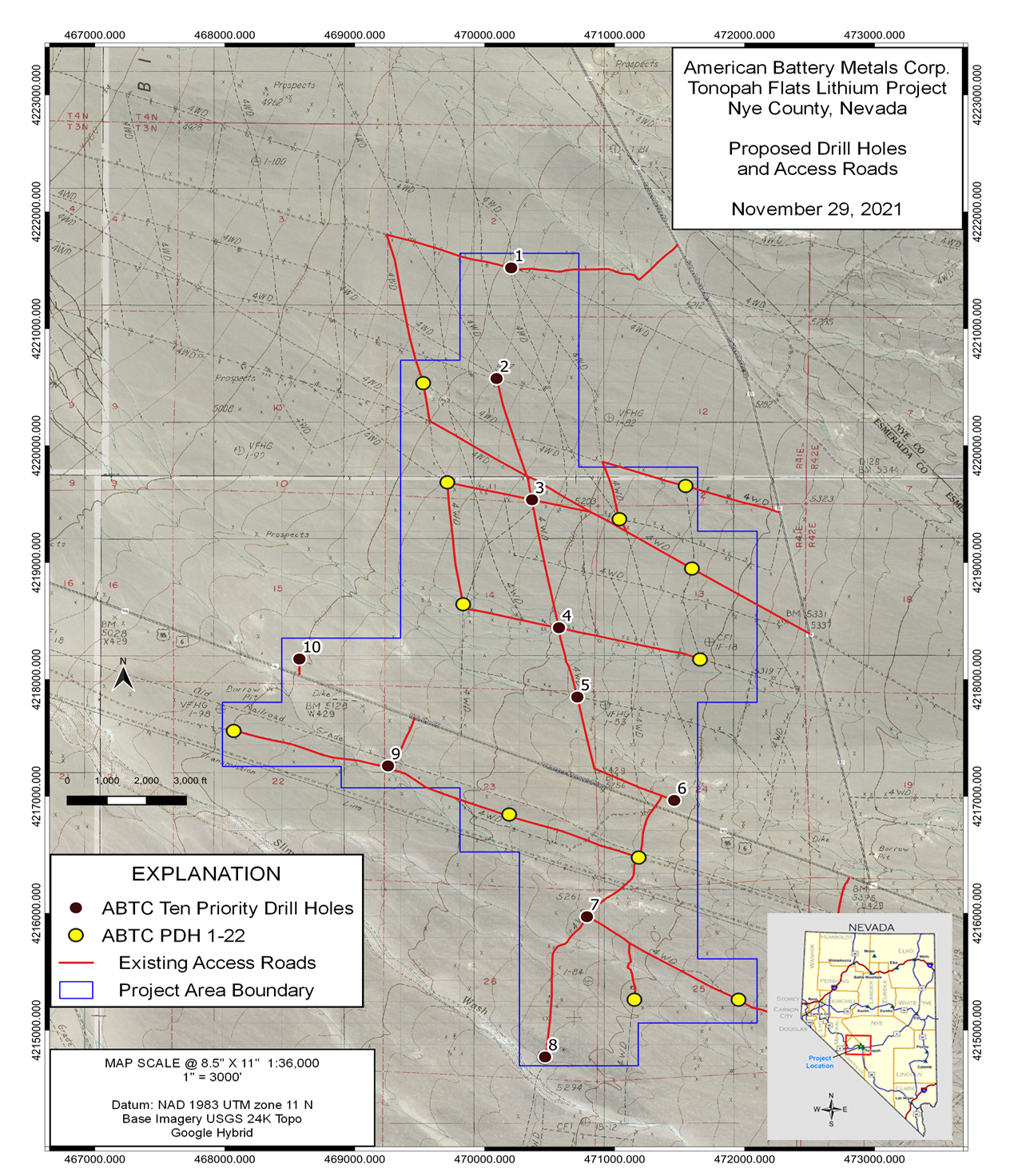 The ABTC Tonopah Flats Lithium Exploration Project currently encompasses the exploration, sampling, and analysis of 427 unpatented lode mining claims covering approximately 8,540 acres of land. The company will continue conducting geological mapping, sampling, geochemical analysis, and proprietary extraction trials to characterize these high potential resources and to quantify the performance of its internally developed lithium extraction and manufacturing operations.