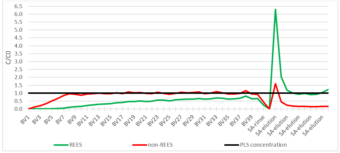 40 column bed volumes (BV’s) of the PLS were passed through the resin bed in the column before rinsing and eluting with sulfuric acid. The results of which were plotted below and “normalized”, enabling the data to be plotted on the same scale, so that the relative impact of the REE’s and non-REE’s can be directly compared. In Figure 1, a C/C0 value of 1.0 represents the initial concentration in the PLS and the graph shows the elution was significantly completed after 3 bed volumes with a 6.3-fold increase in REE concentration compared to the PLS feed.